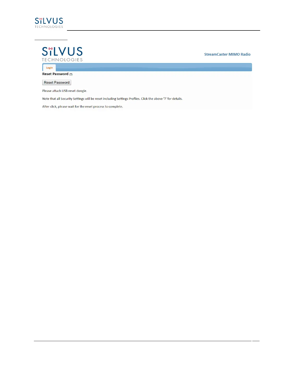 flash drive and a password reset key provided by Silvus. On the USB, the password reset key file