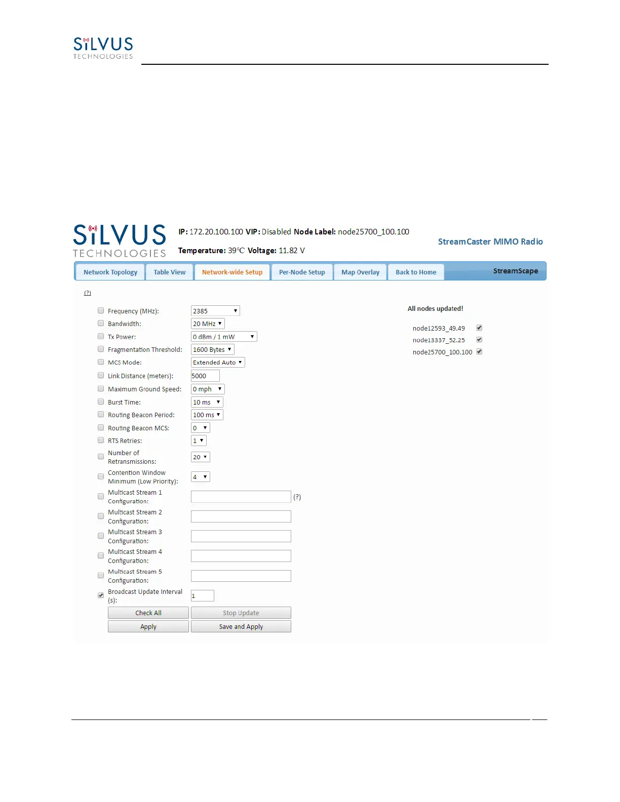 apply and save values to flash. The Broadcast Update Interval field determines how often, in