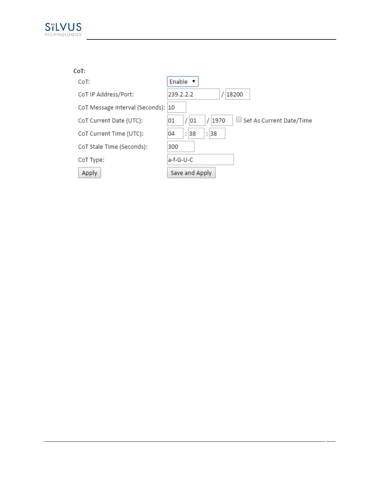 • CoT Current Date (UTC): Time stamp of the date. If Set AS Current Date/Time is selected,