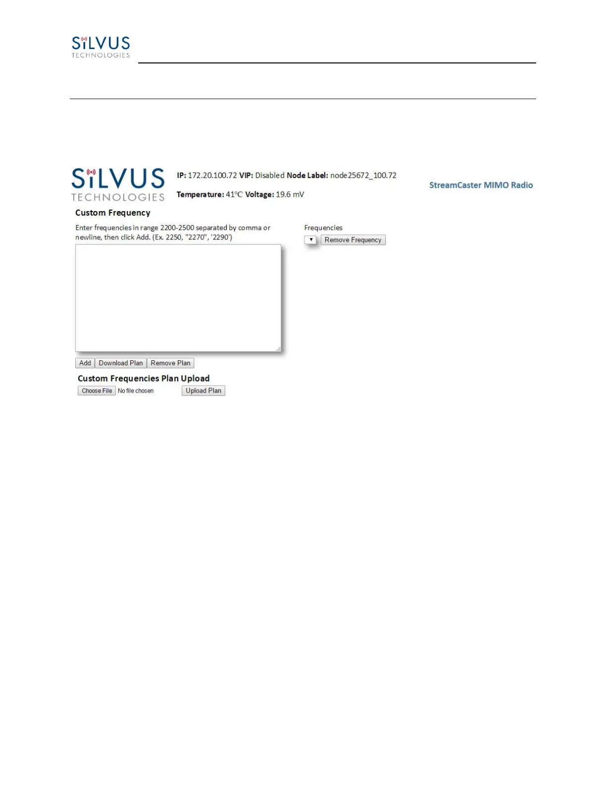 • Custom Frequencies Plan Upload: Upload the selected frequency plan.