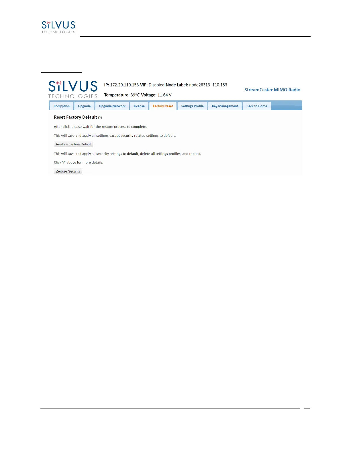 • Zeroize Security: This will set login passwords and all security keys to their defaults. This