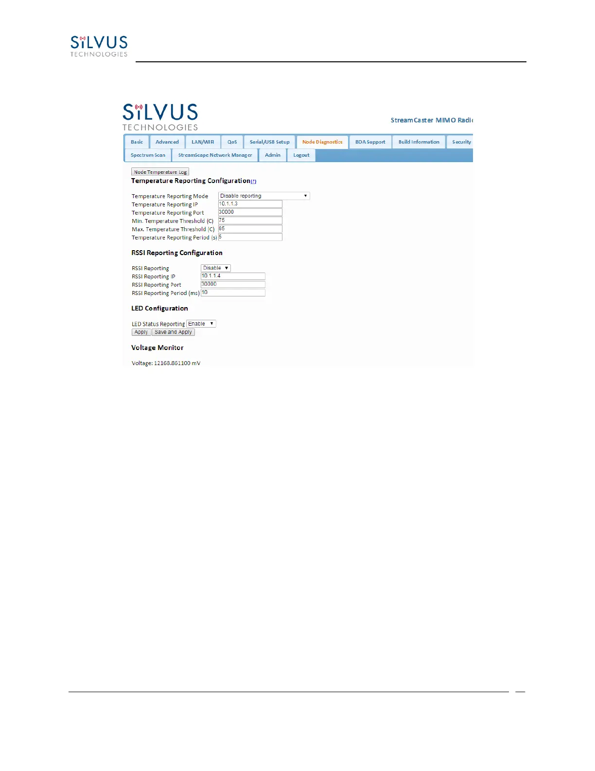 The Node Diagnostics page allows the user to specify an IP and Port number for Temperature and