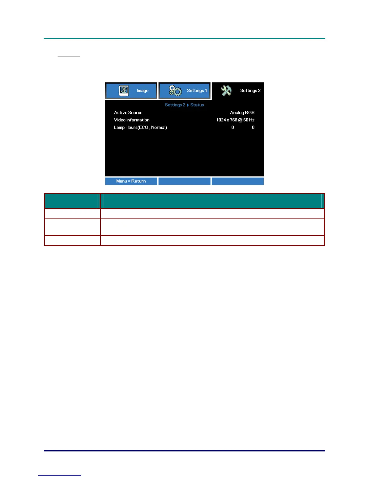 Press the cursor ▲▼ button to move up and down in the Settings 2 menu. Select the Status menu