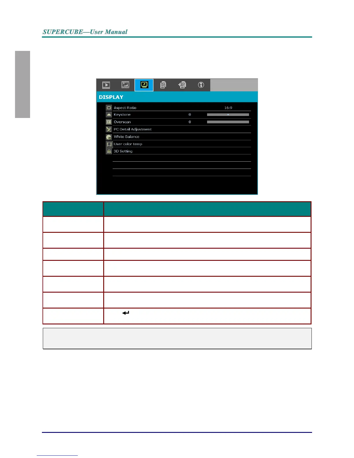 DISPLAY menu. Press the cursor ▲▼ button to move up and down in the DISPLAY menu.