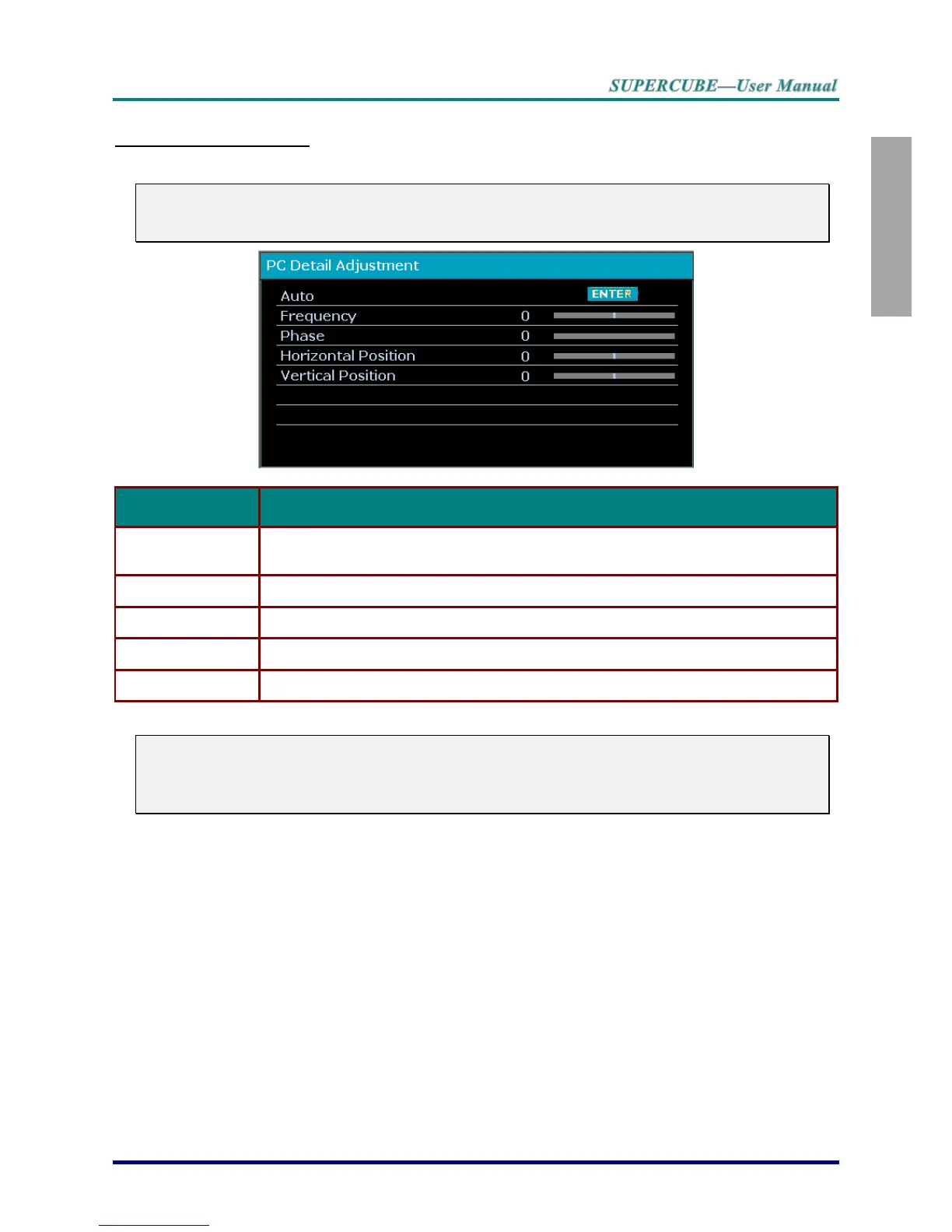 If the Auto Adjust operation cannot optimize the PC signal, try to adjust FREQUENCY and