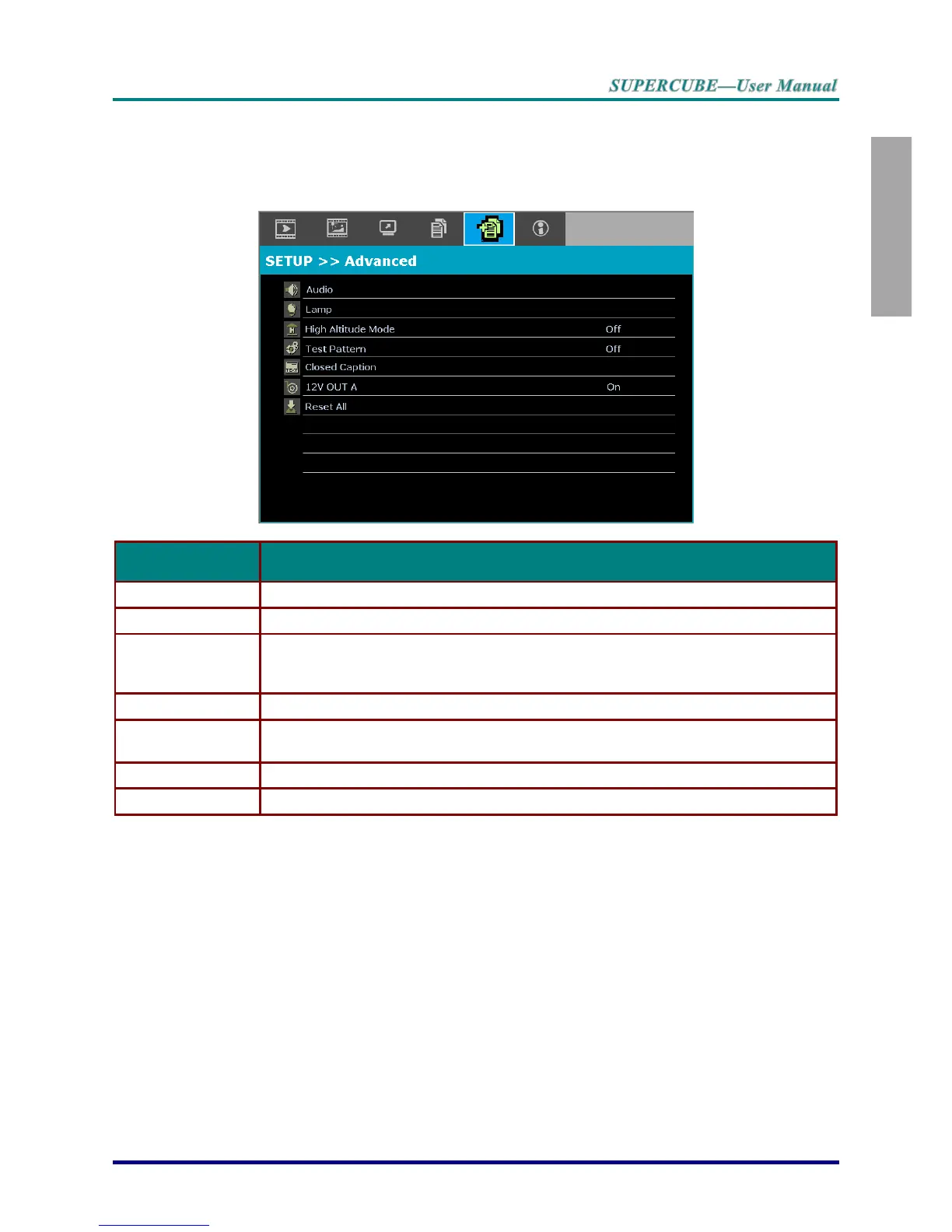 SETUP>>Advanced menu. Press the cursor ▲▼ button to move up and down in the