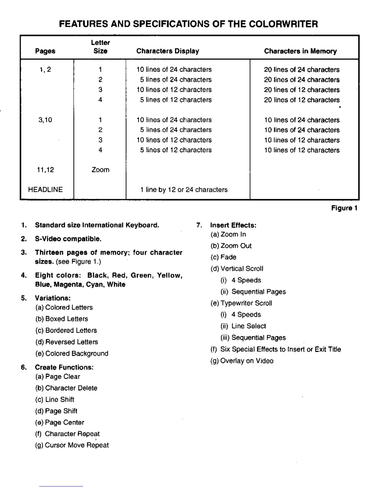 Sima ColorWriter Magic - FEATURES AND SPECIFICATIONS OF THE COLORWRITER; Keyboard and Compatibility; Memory and Color Options; Title Variations and Creation Functions