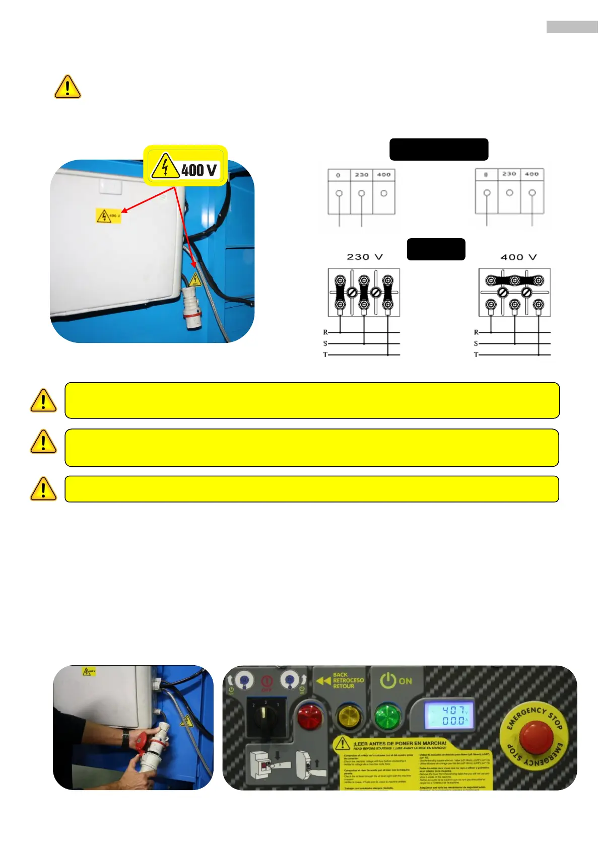 eléctrica de la máquina de 400V a 230V, cambie las pegatinas de indicación de voltaje con el fin de
