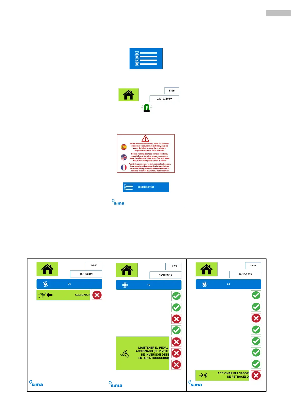 Al pulsar el botón de “COMENZAR TEST”, se iniciará la comprobación, de forma que el sistema irá solicitando
