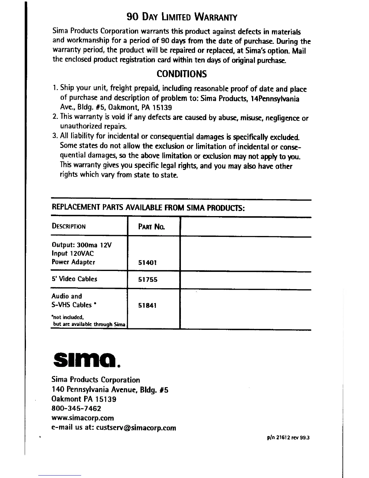 Sima SED-CM - Warranty and Parts Information; 90-Day Limited Warranty Details; Replacement Parts and Contact