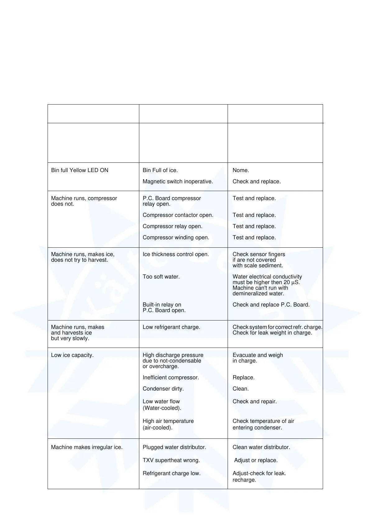 Low ice capacity. High discharge pressure Evacuate and weigh