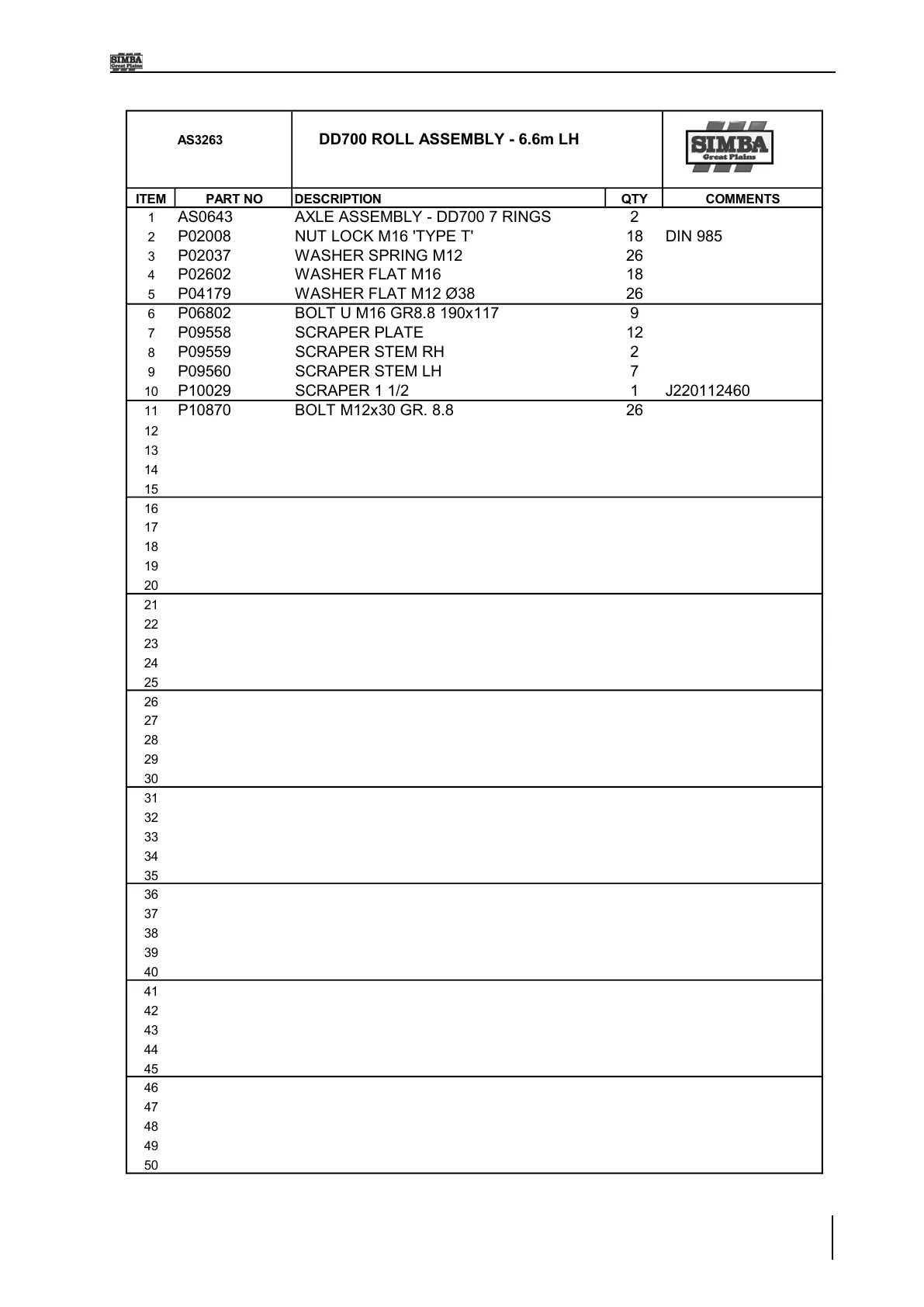 ITEM PART NO DESCRIPTION QTY COMMENTS