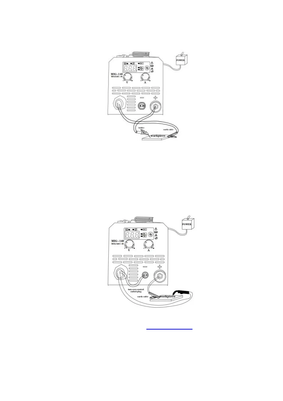 3. Connect the MIG torch to the “-” negative terminal on the left side, Connect the two-core