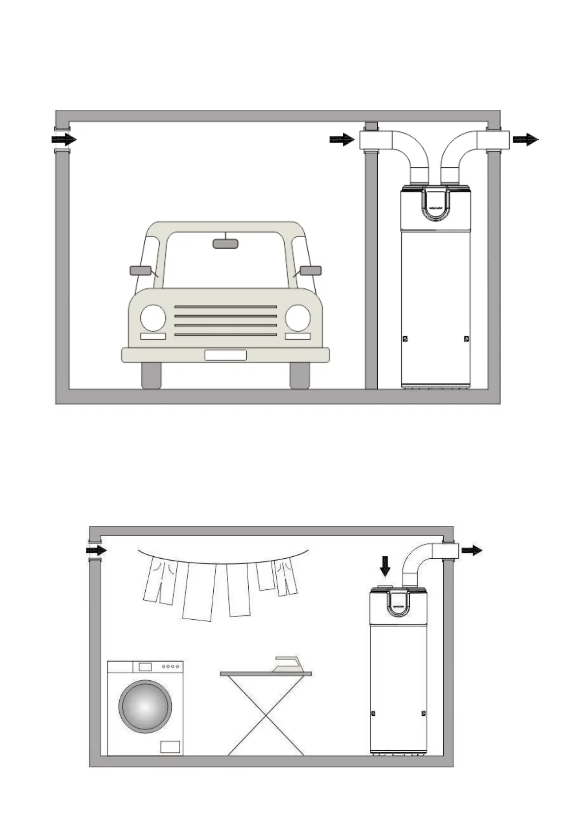 Aria in ingresso dal locale senza condotto, aria in uscita canalizzata verso l'esterno. Lunghezza del