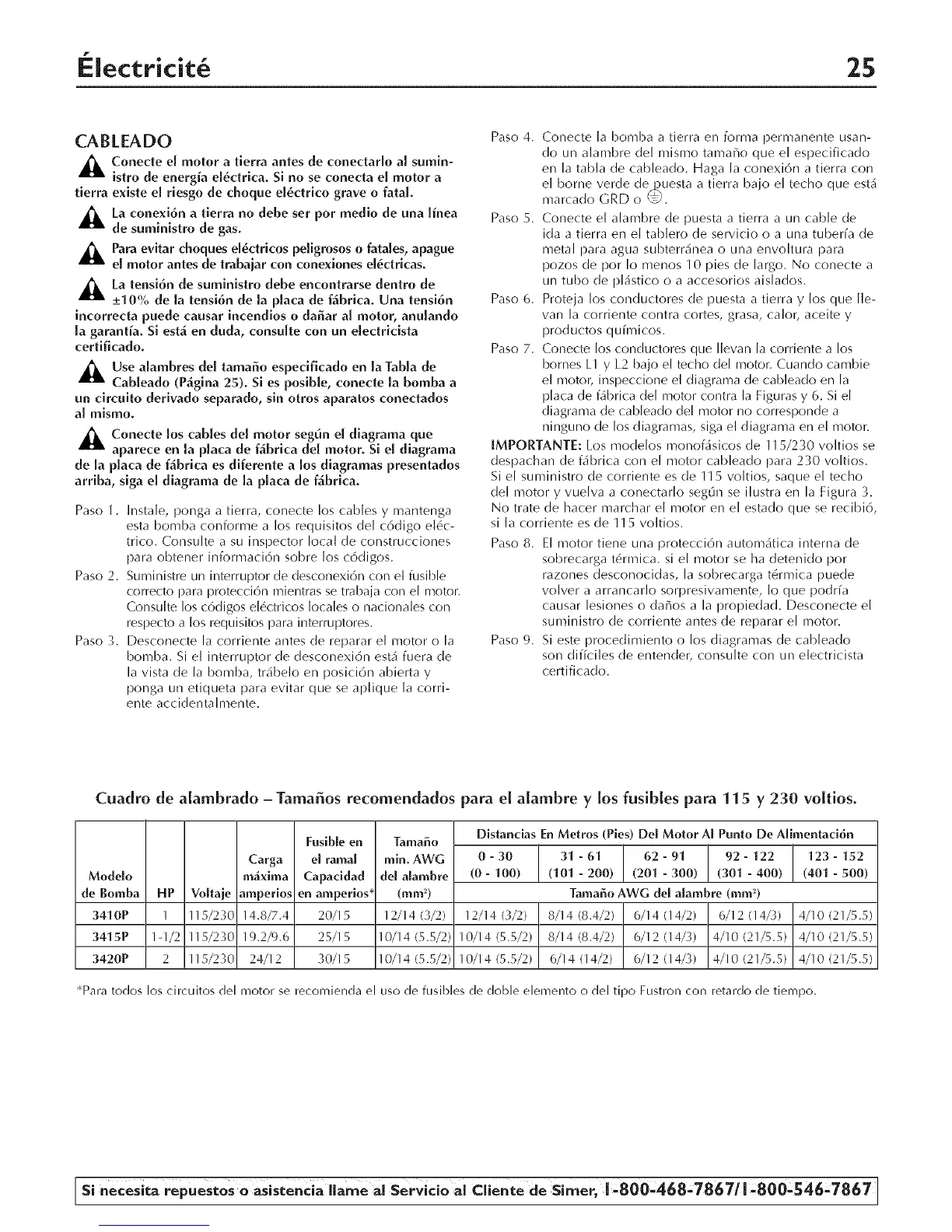 Cuadro de alambrado - Tamaffos recomendados para el alambre y los fusibles para 115 y 230 voltios.