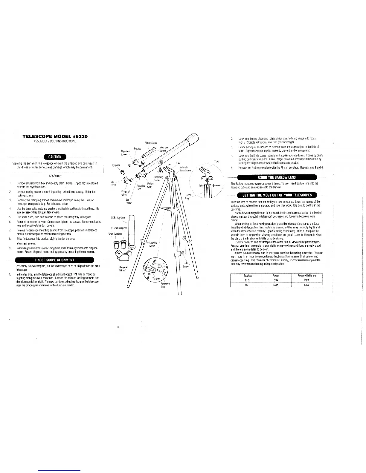 Simmons 6330 - Telescope Assembly and Usage; Assembly Instructions; Finder Scope Alignment; Using the Barlow Lens