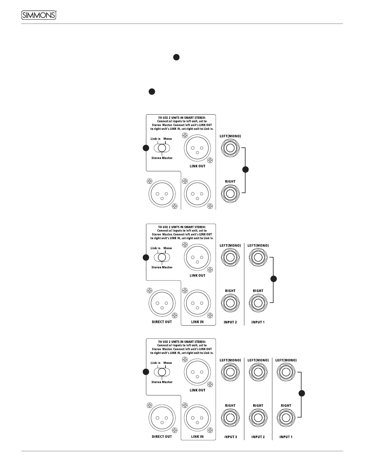 • Stereo Input: use 2 cables to connect to both the INPUT 1 LEFT(MONO) and RIGHT jacks