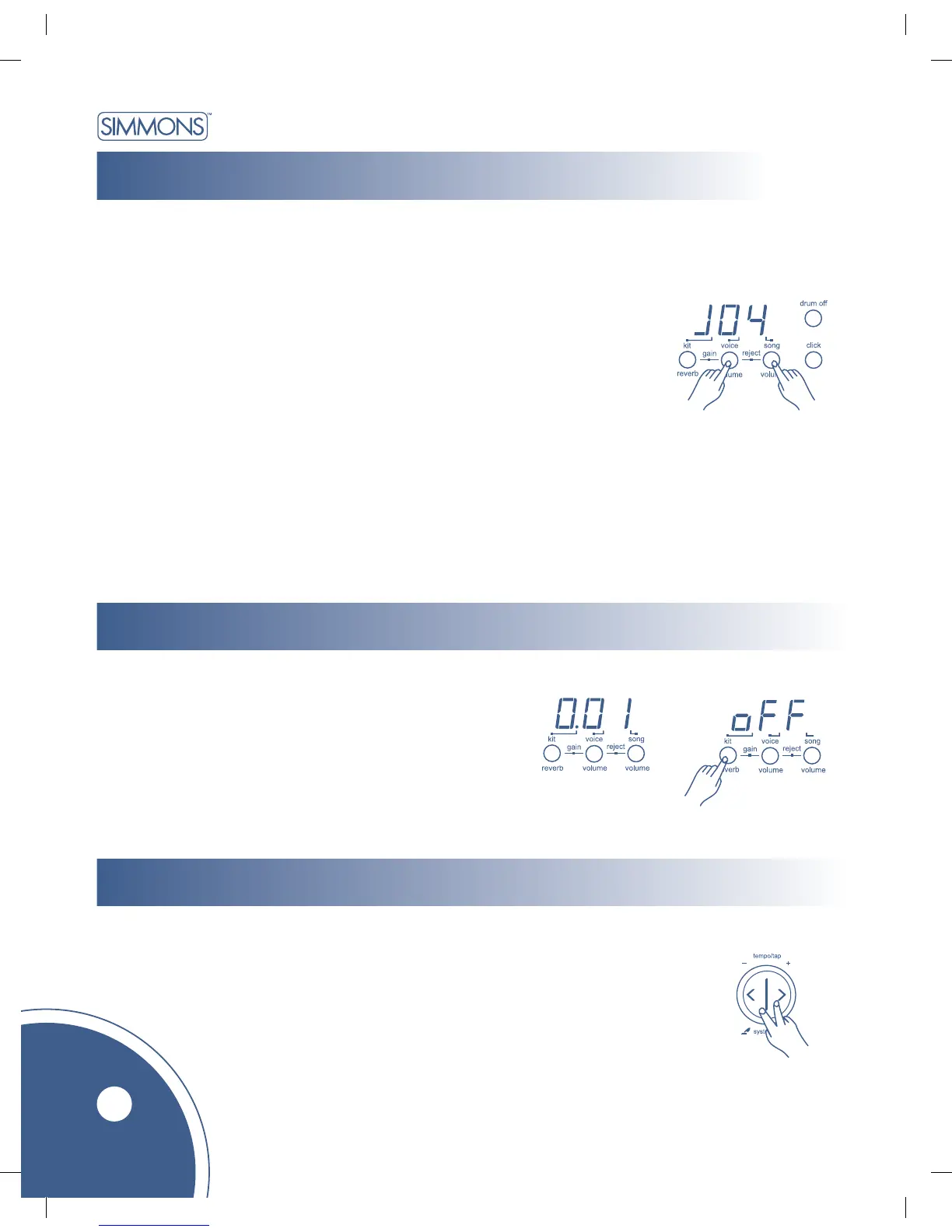 1. Hold down [voice/volume] and press [song/volume] buttons. Display shows: