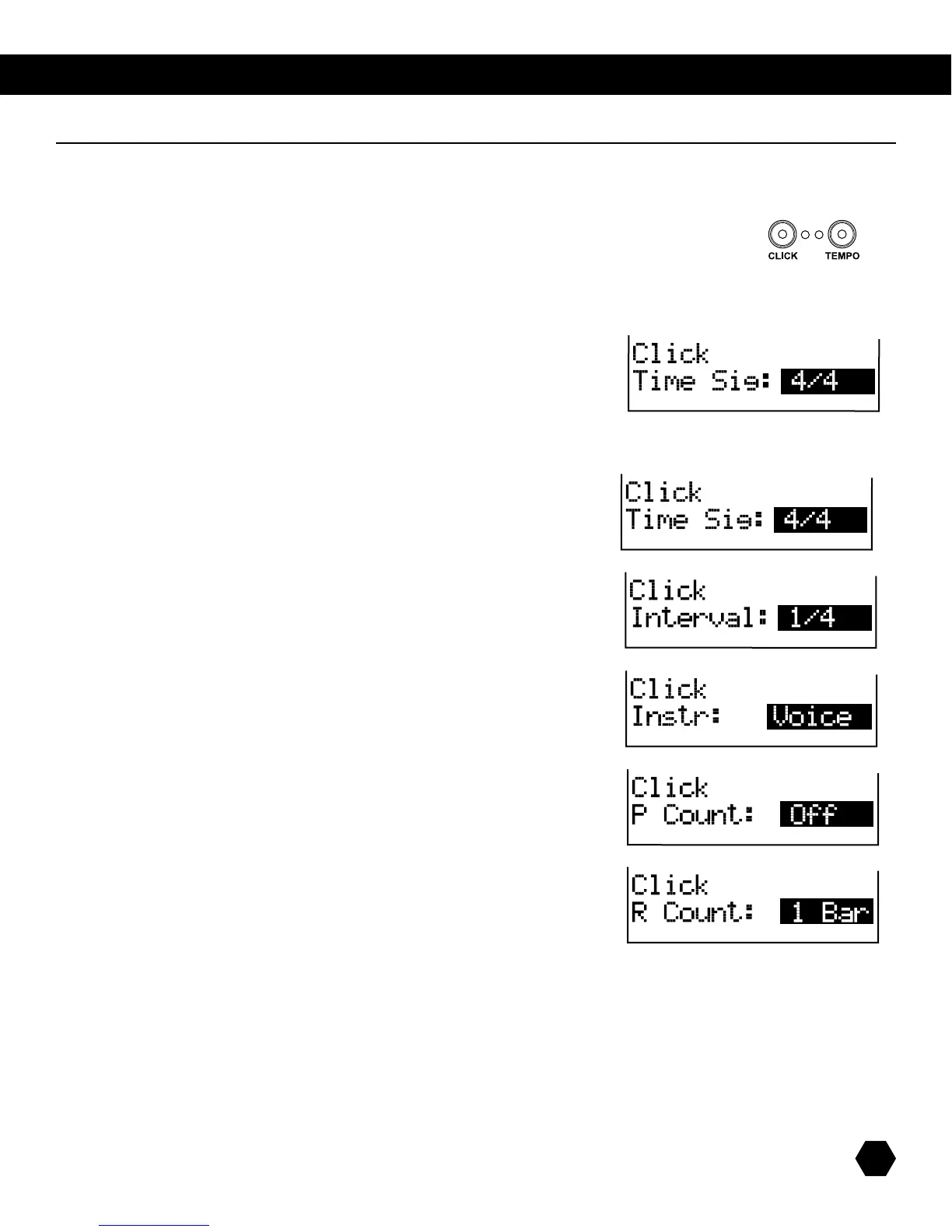 Usethe[PAGE]buttonstoscrollthroughthevariousClickparametersandthedatawheelor[+]/[-]buttonstoadjustthevalue.