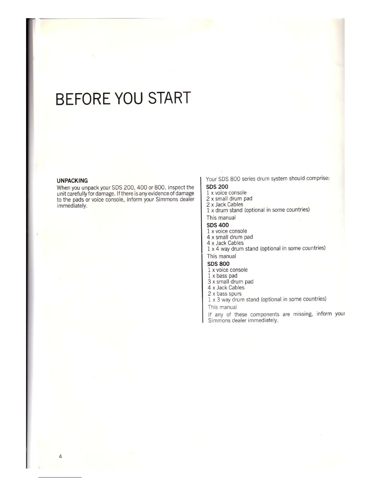 Simmons SDS 800 - BEFORE YOU START; Unpacking and Inspection