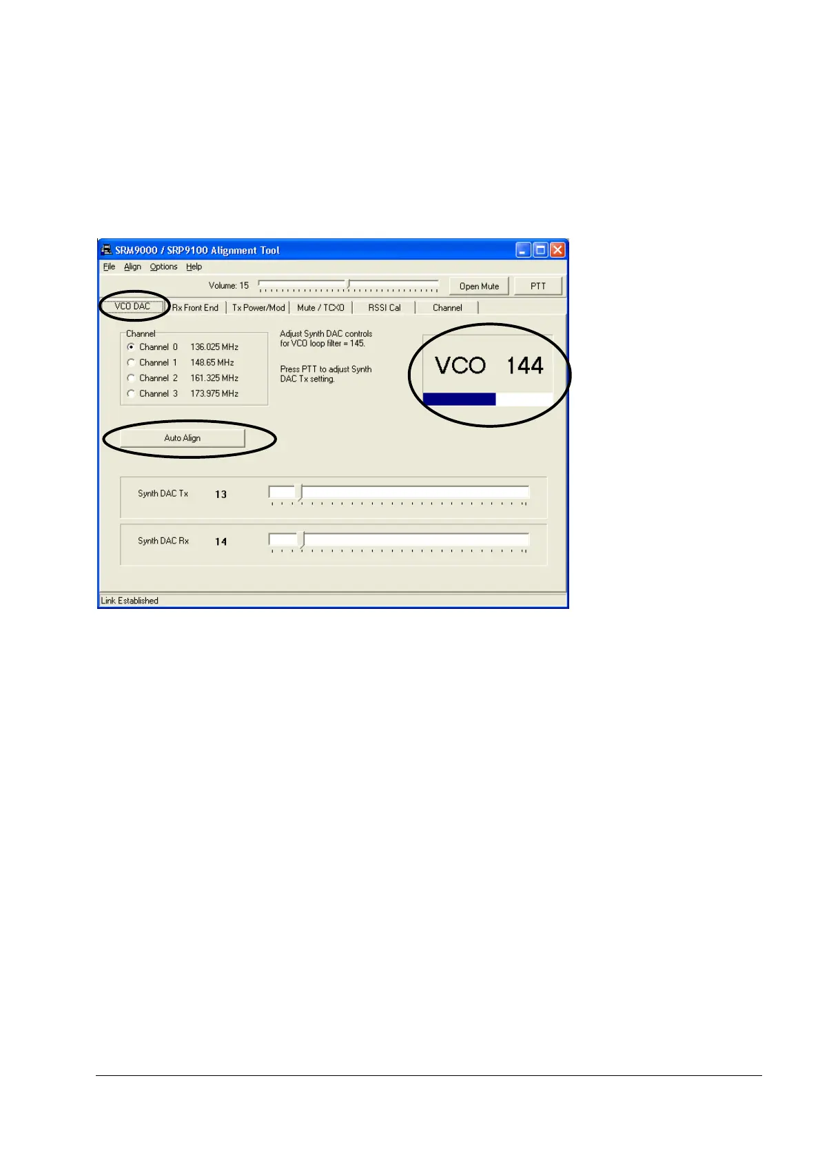 each transmitter alignment frequency to set the VCO loop filter value between 140 and 150.