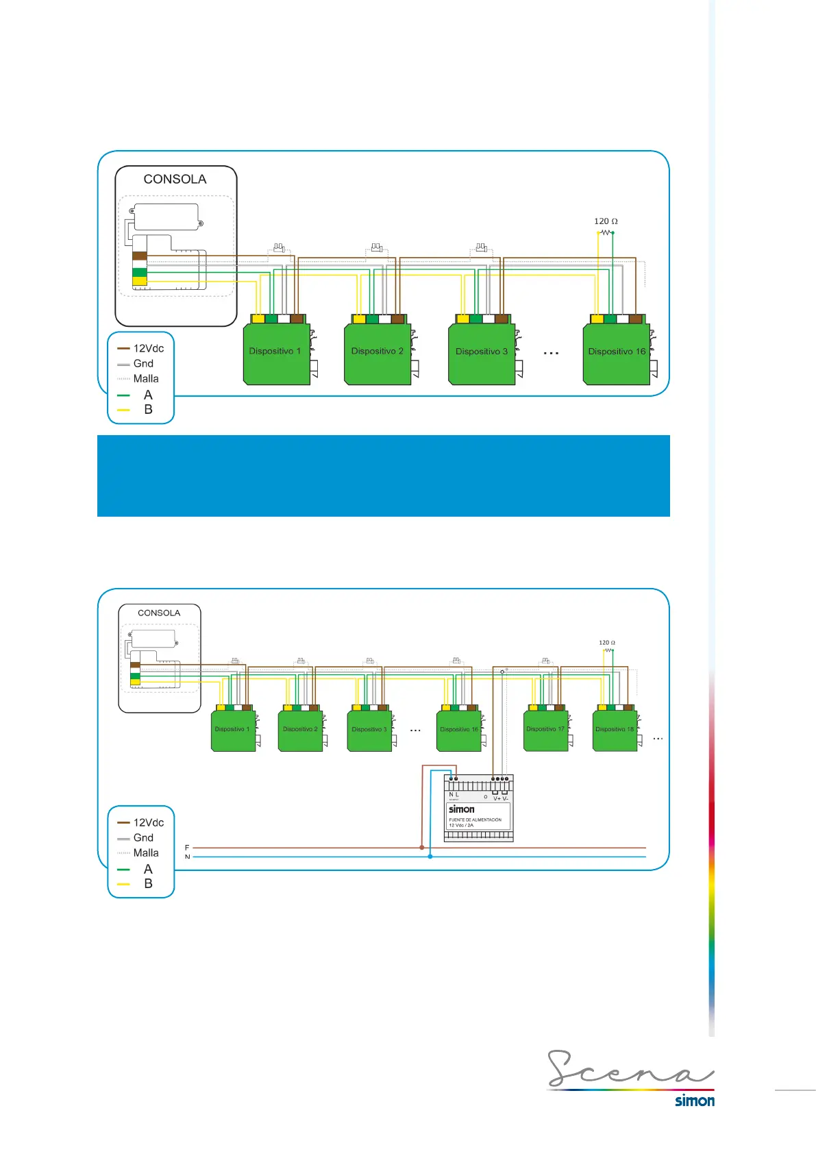 De cada dispositivo debe entrar un cable de comunicaciones y salir otro cable por el mismo conector hacia el