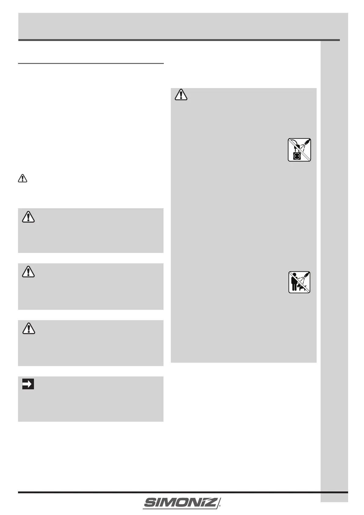 • The water spray must never be directed