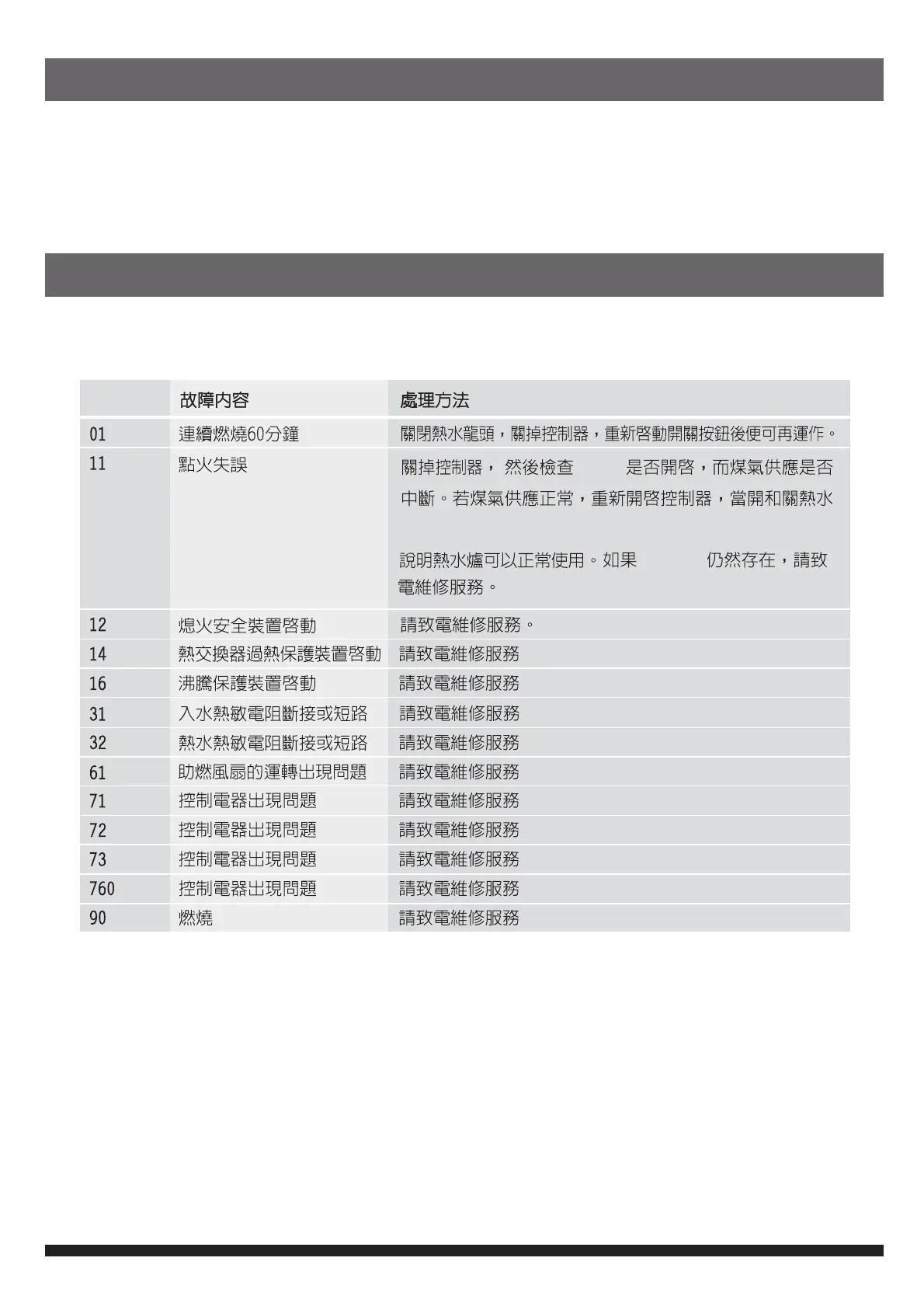 在一些情況下,關閉熱水水龍頭然後重新開啟,故障訊號有可能取消。如故障訊號仍然存在,可嘗試關