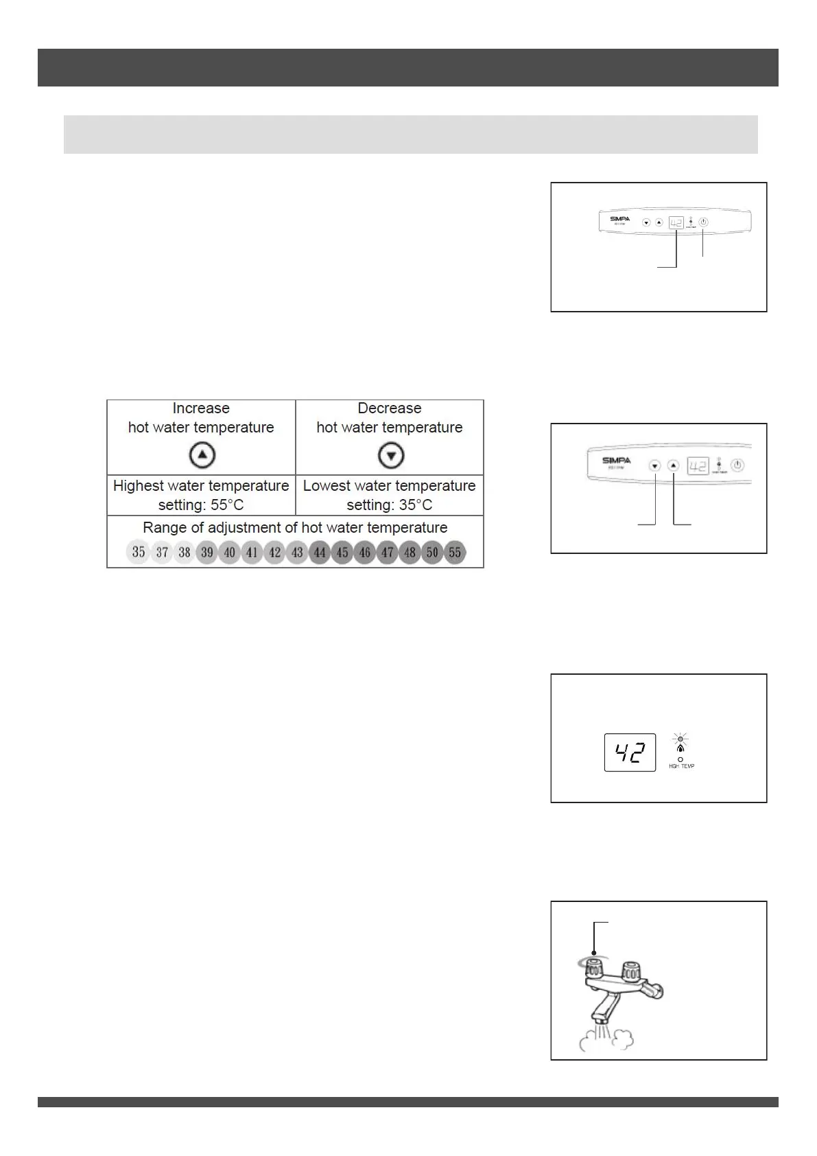 50°C or above, hot water temperature can only be decreased.