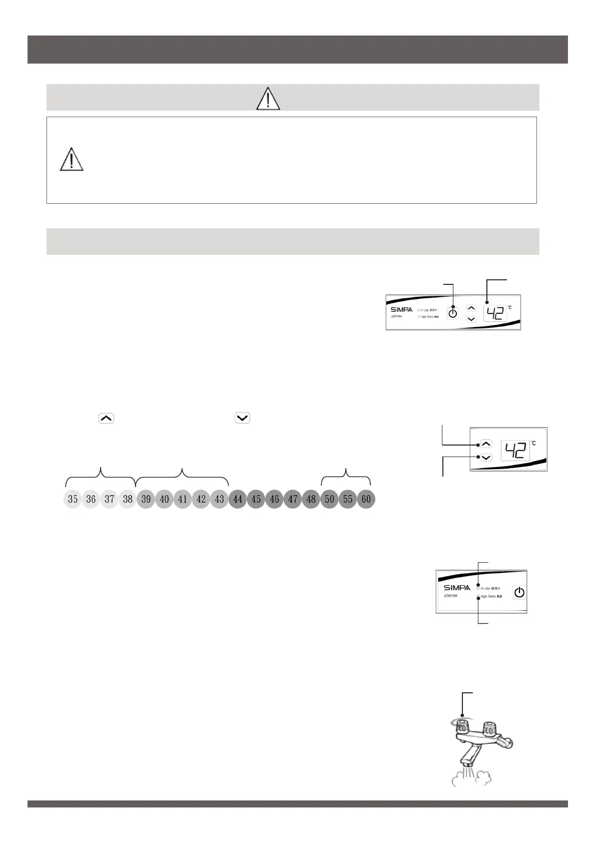 熱水爐運作時,熱水溫度設定不可高於 48℃。