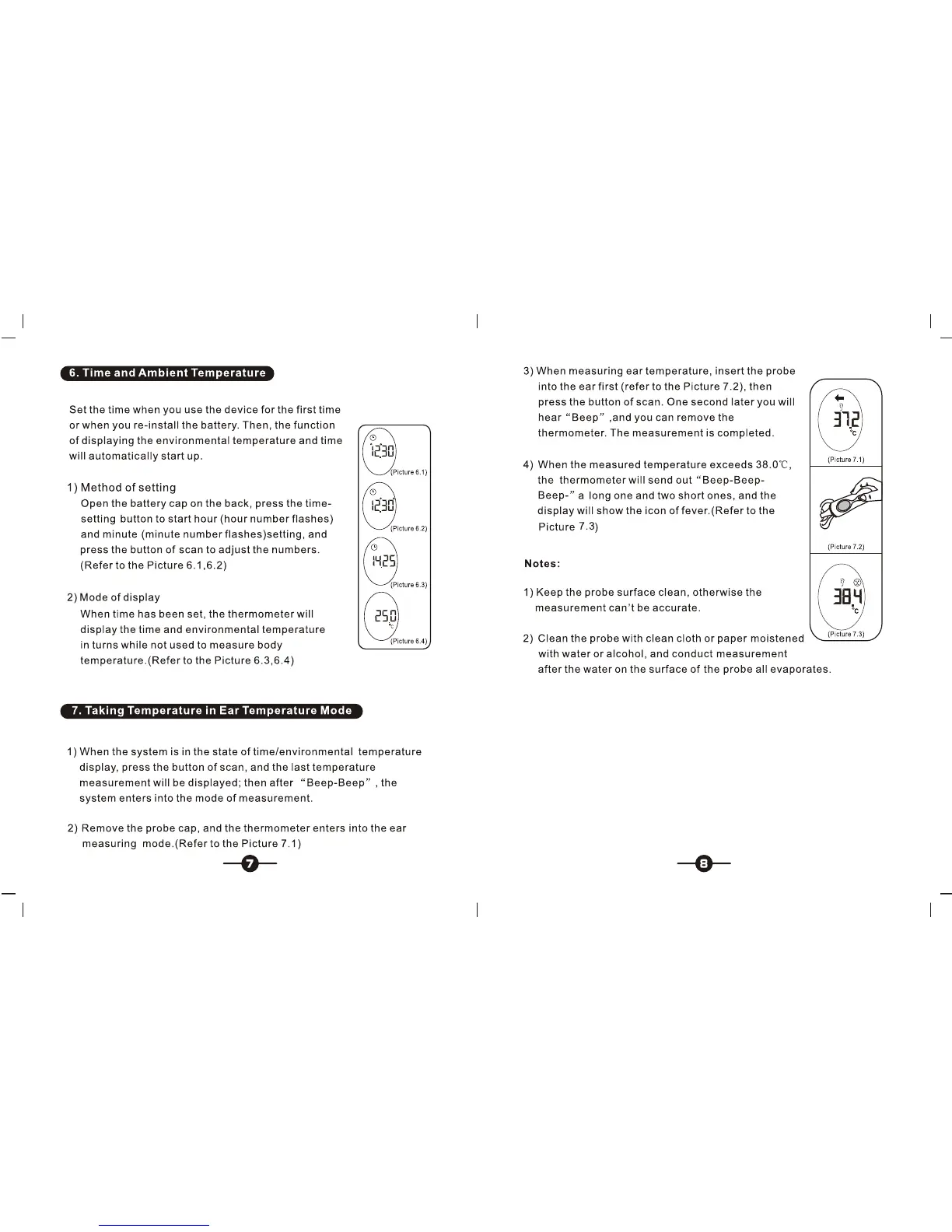Simple FDIR-V1 - Time and Ambient Temperature Setting; Setting Time and Display Mode; Taking Temperature in Ear Mode; Ear Measurement Procedure and Alerts