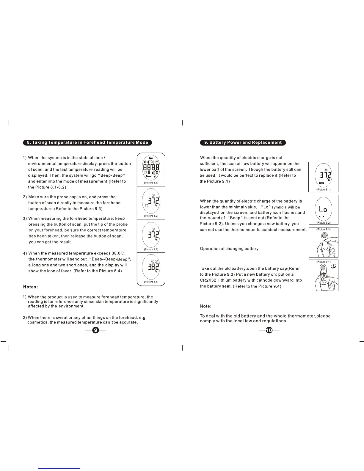 Simple FDIR-V1 - Taking Temperature in Forehead Mode; Forehead Measurement Procedure and Alerts; Battery Power Management; Low Battery Indicators and Warnings