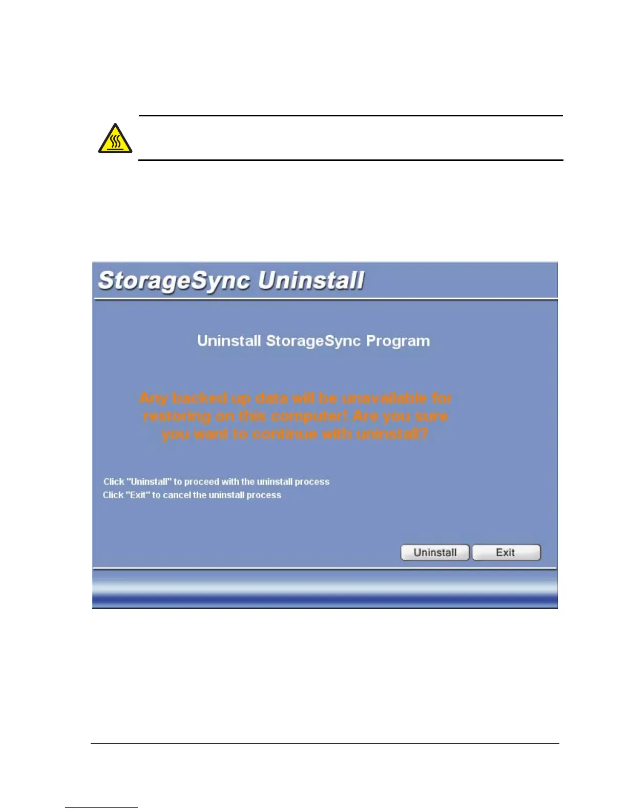2. Point to Programs, StorageSync, and Uninstall. The uninstallation screen appears (see