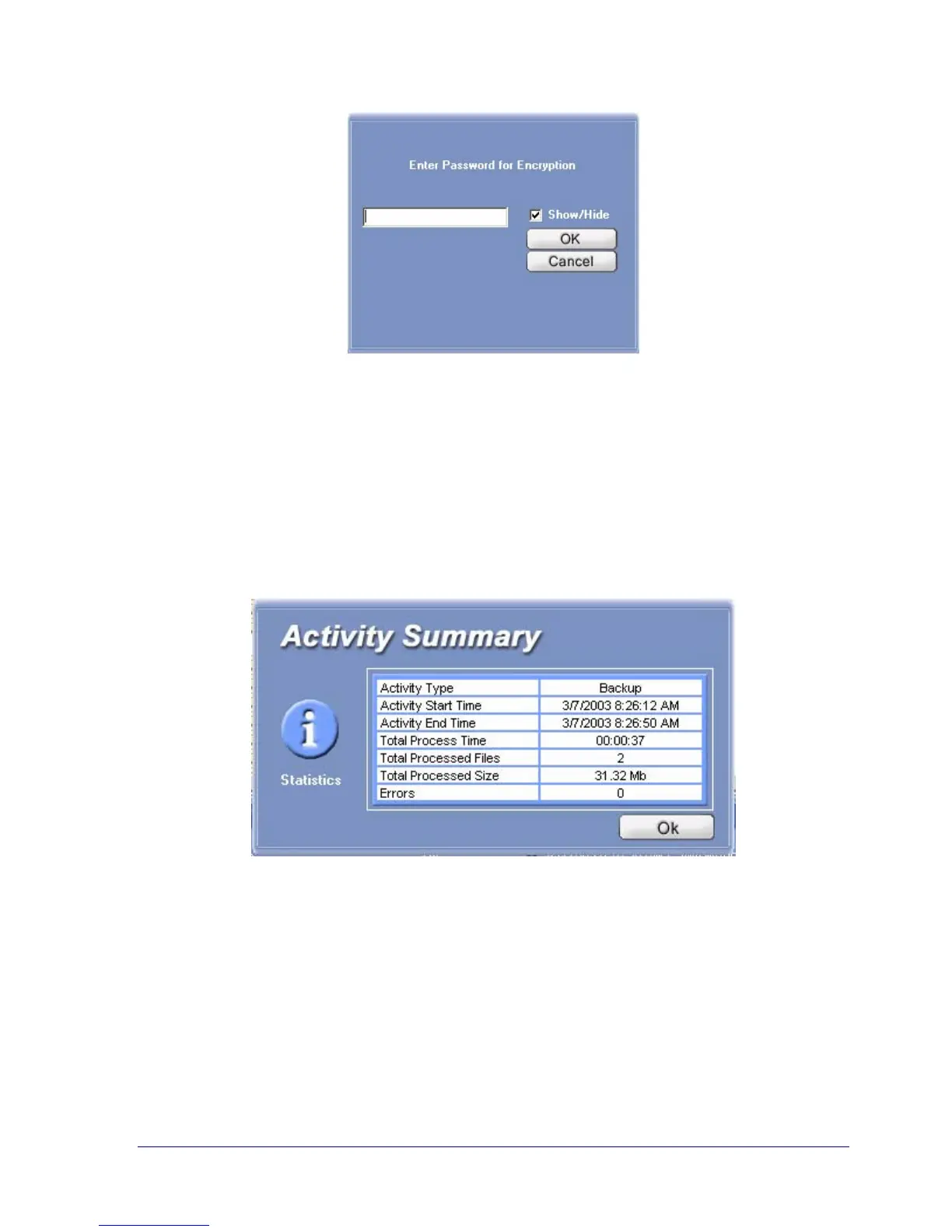 Figure 16. Sample Activity Summary Window After a Data Backup Operation