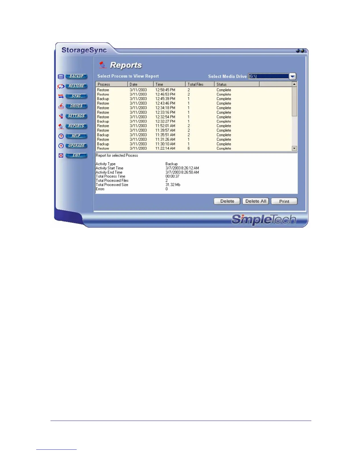 SimpleTech FV-U35/250 - Figure 34. Reports Window