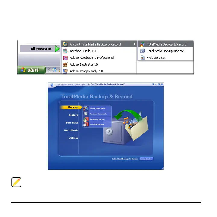 To start TotalMedia Backup & Record, click Start, All Programs, ArcSoft TotalMedia Backup &