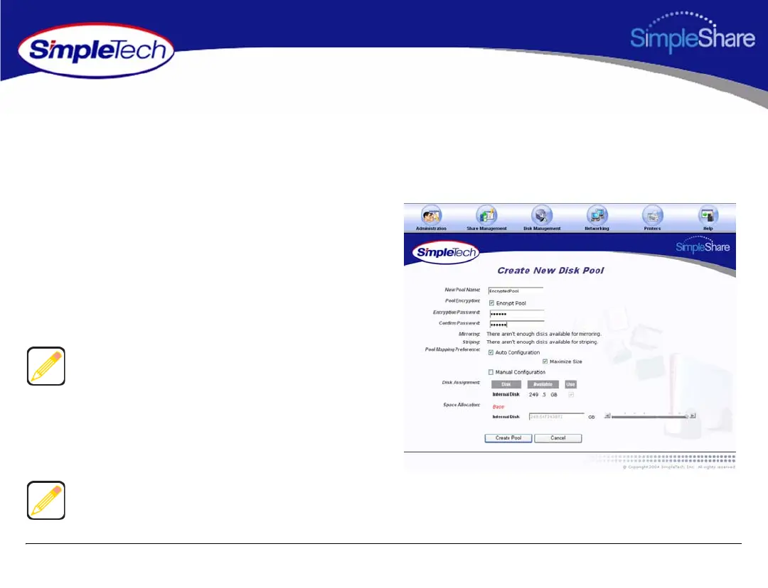 Encrypted pools provide security for the data stored in the pool. Encrypted pools must be remounted whenever SimpleShare is