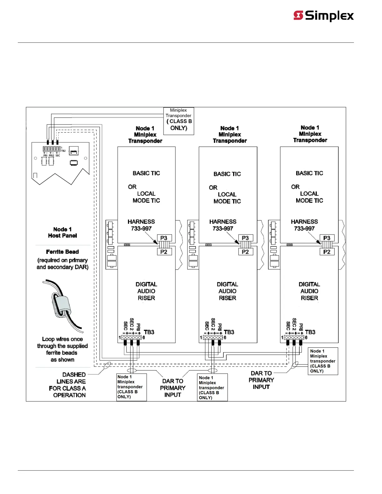 Figure 13 is an illustration of class A and class B digital wiring from the 4100-1411 ES Net Digital Audio Controller to the digital audio risers connected