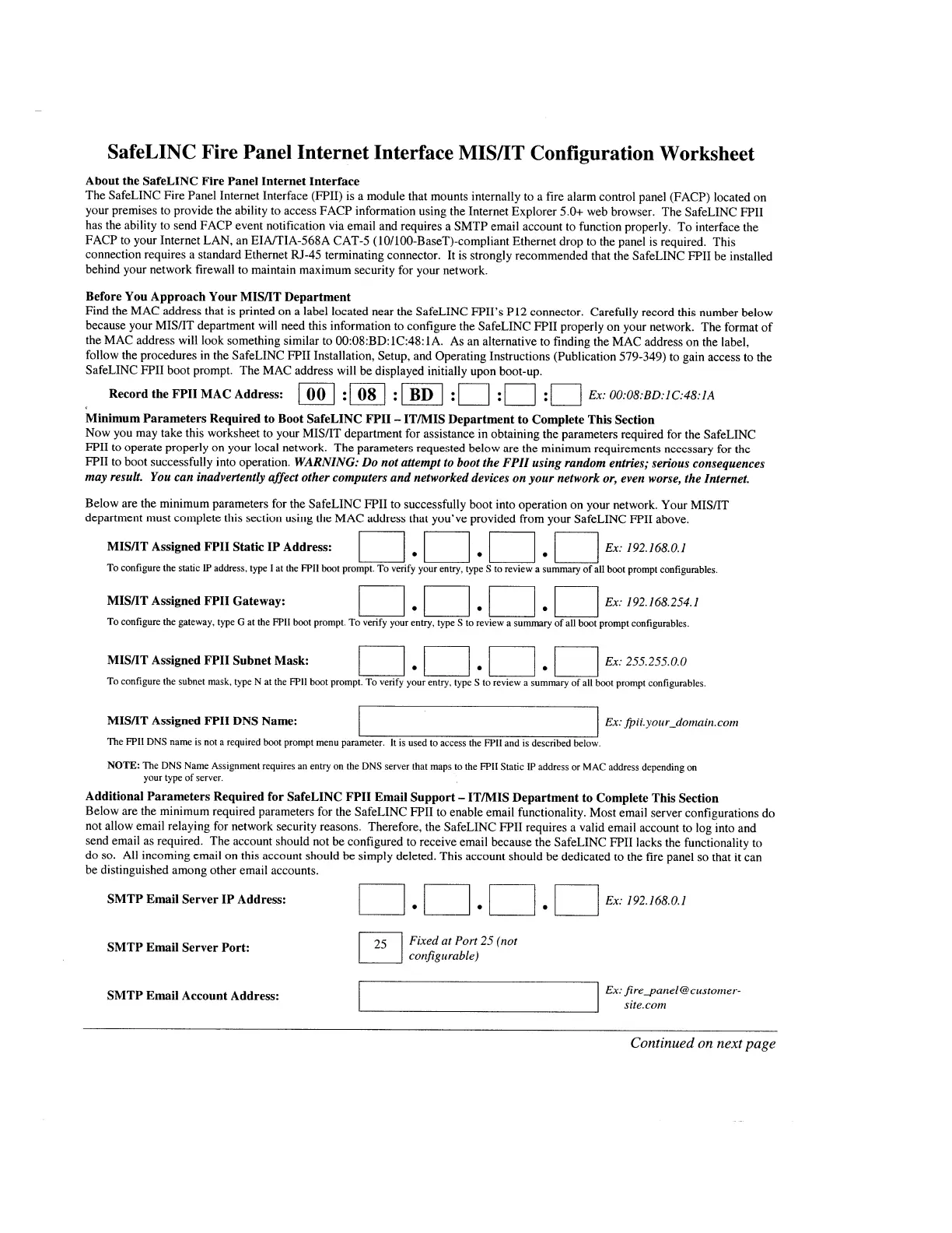 Simplex SafeLINC 4100-6060 - MIS;IT Configuration Worksheet