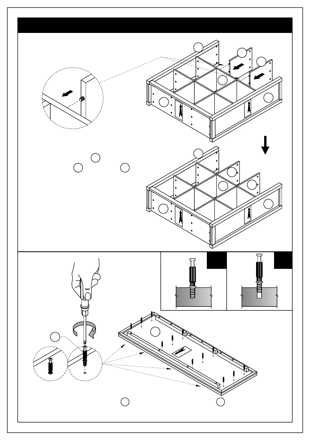 1. Attach twelve Cam Lock Pins 2 into pre-drilled holes on Top A .