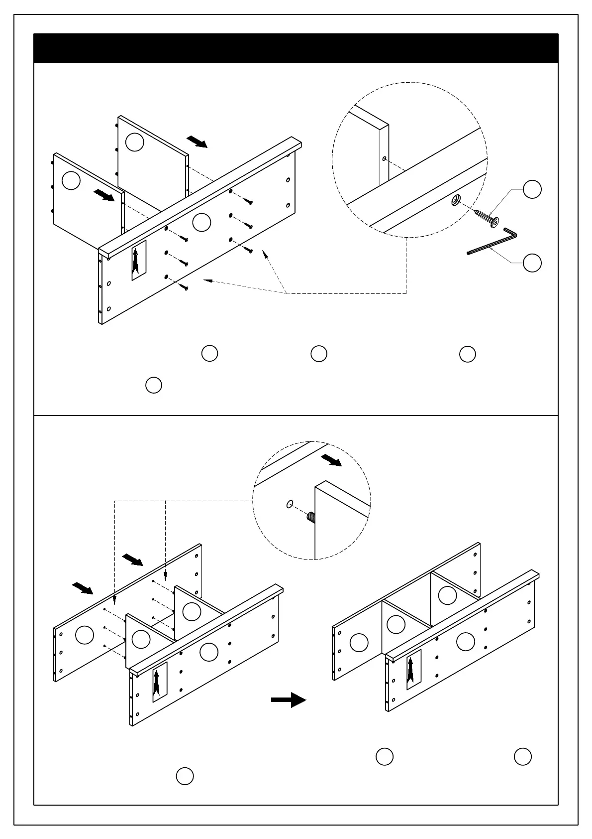 1. Attach Bottom Dividers C to Bottom Shelf E using Allen Key Screws 1 through