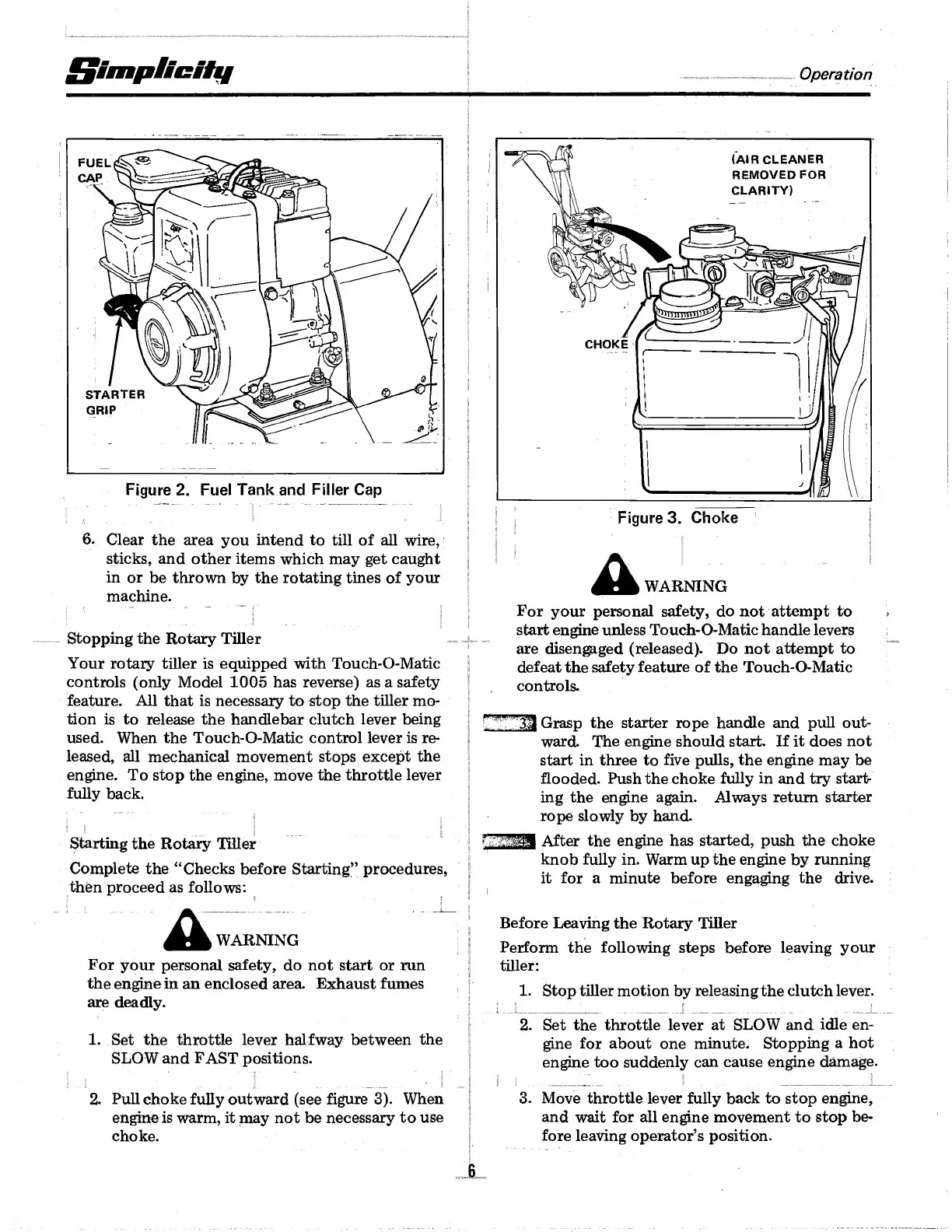 Simplicity 1003 - Stopping the Rotary Tiller; Starting the Rotary Tiller