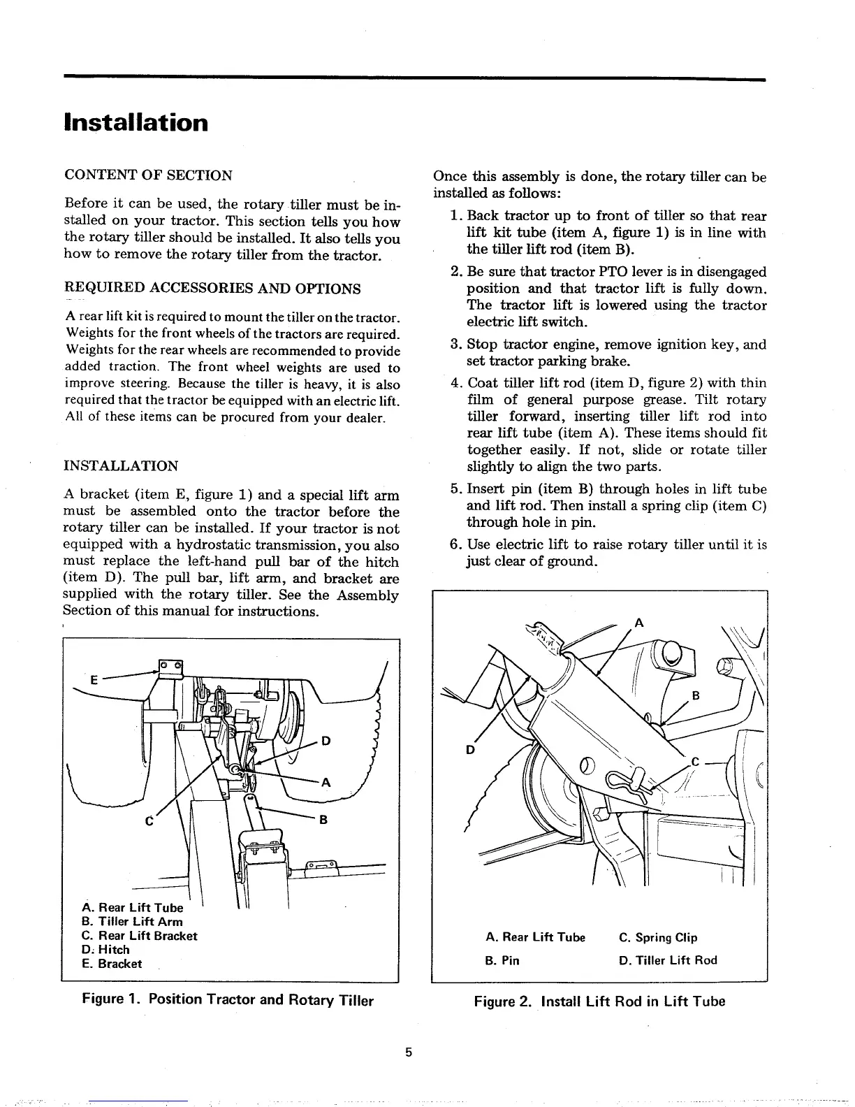 Simplicity 1690287 - Installation; Required Accessories and Options; Position Tractor and Rotary Tiller; Install Lift Rod in Lift Tube