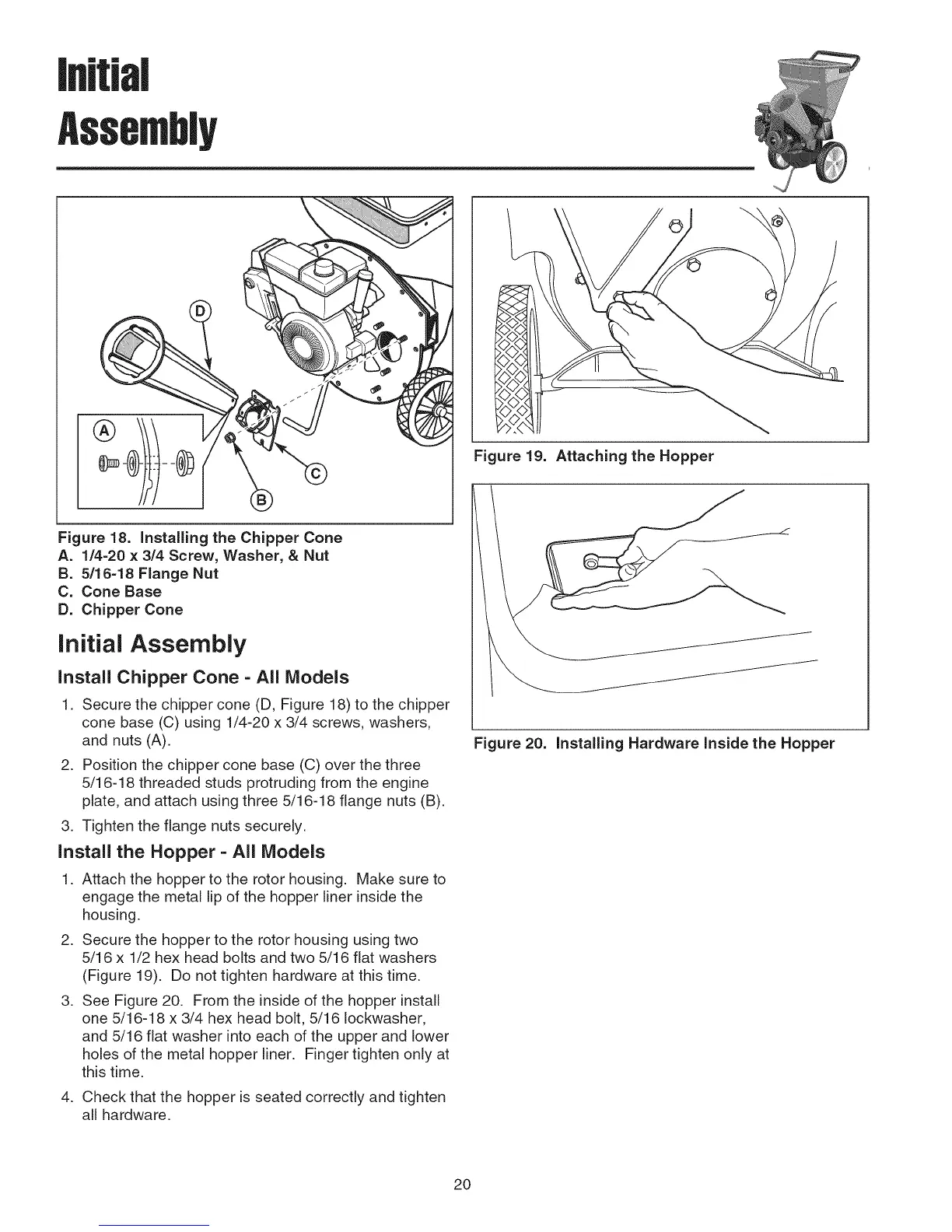 1. Secure the chipper cone (D, Figure 18) to the chipper