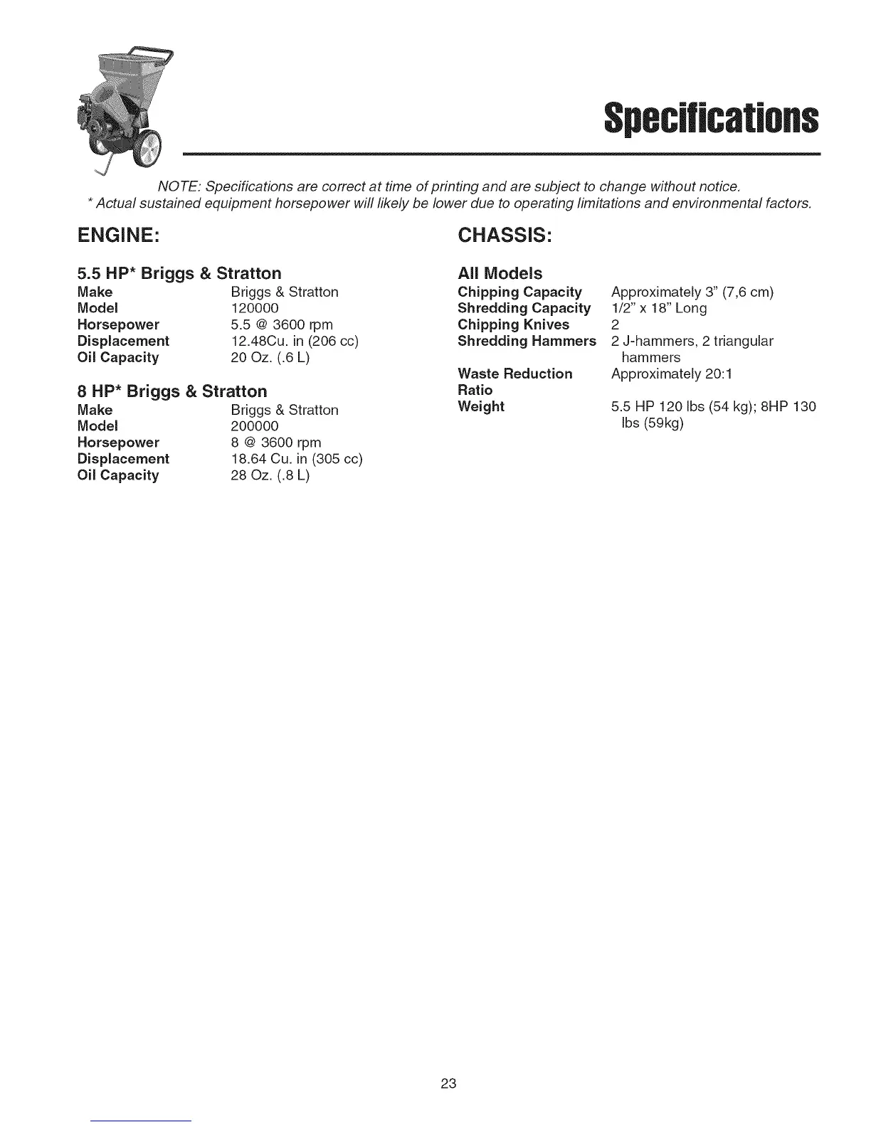 5.5 HP 120 Ibs (54 kg); 8HP 130