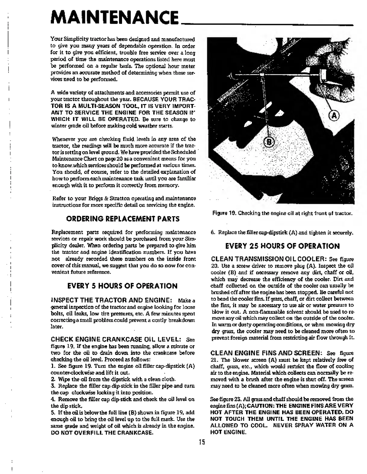 Simplicity 759 3415H - Maintenance; Ordering Replacement Parts; Every 6 Hours of Operation; Every 25 Hours of Operation