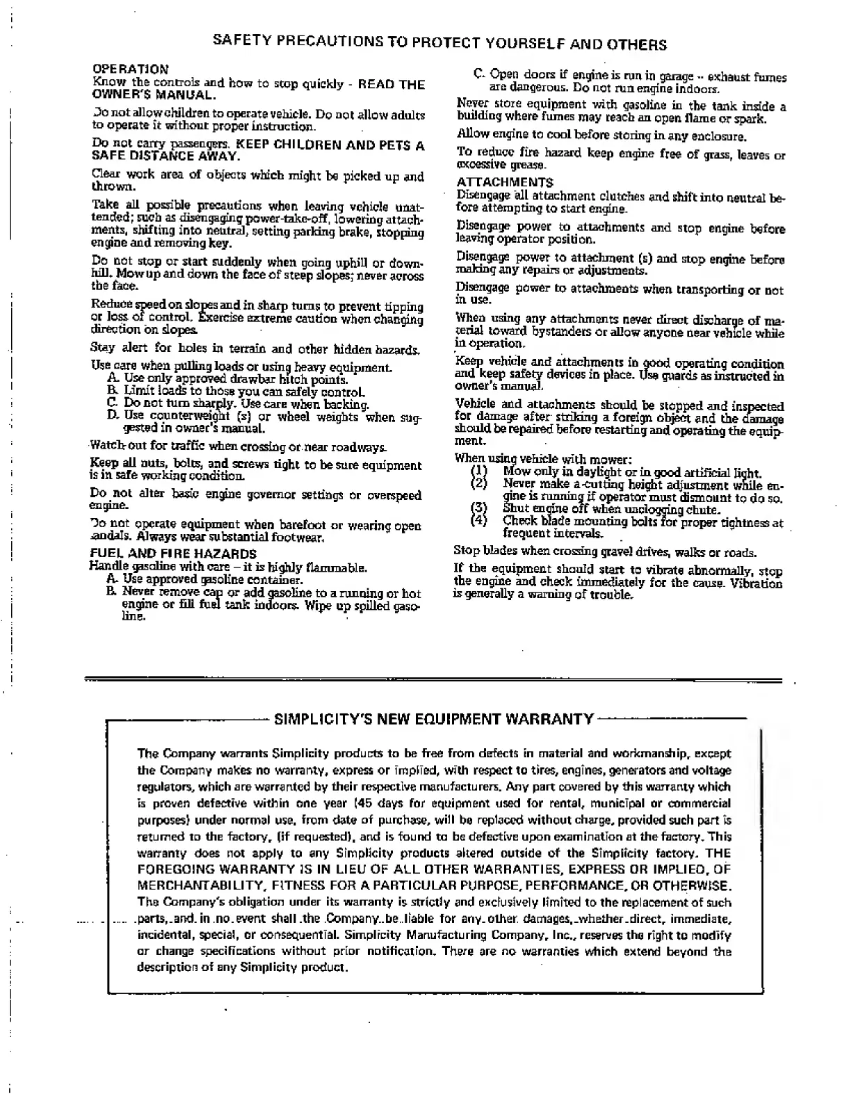 Simplicity 759 3415H - SIMPLICITY NEW EQUIPMENT WARRANTY F; Protect Yourself and Others; Operation