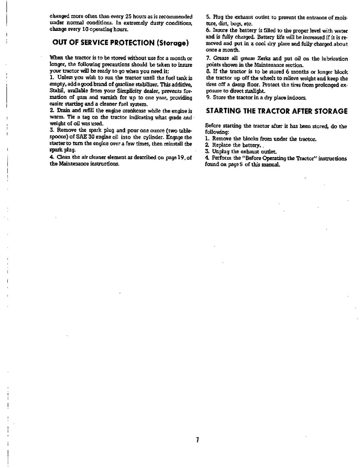 Simplicity 759 3415H - Out of Service Protection (Storage); Starting the Tractor after Storage