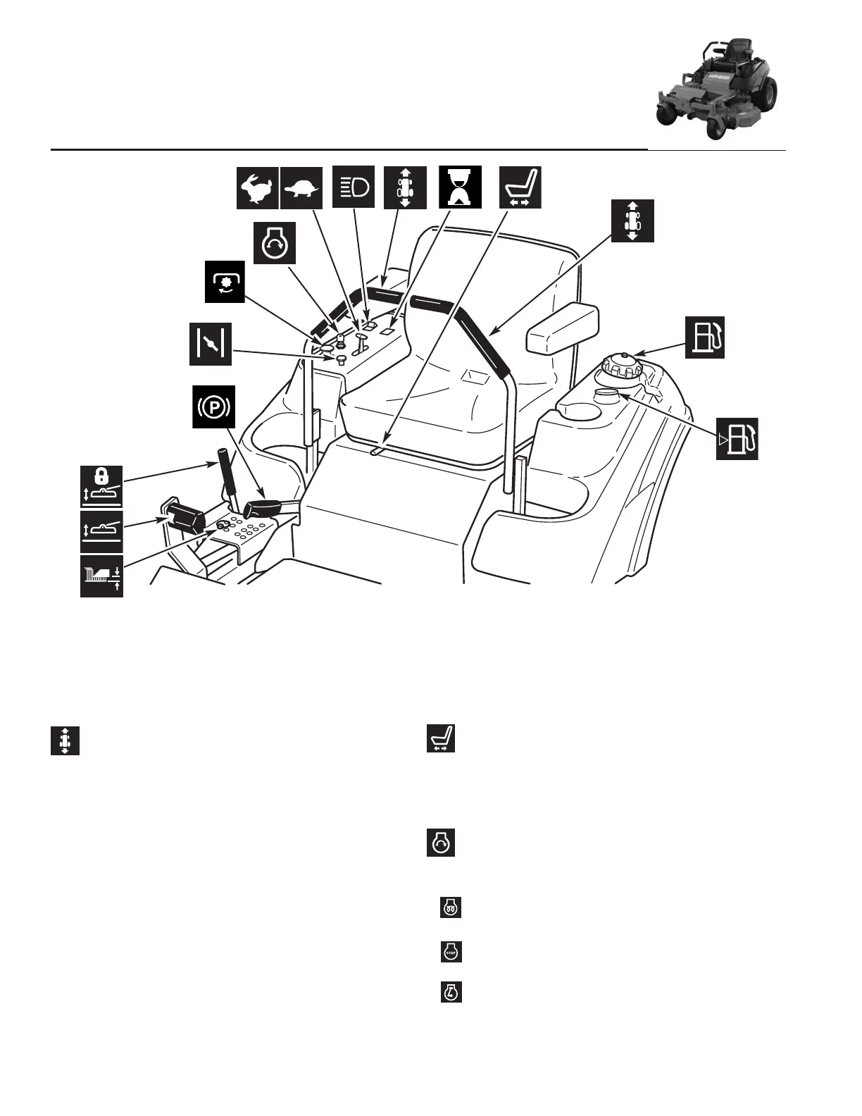 The information below briefly describes the function of individual controls. Starting, stopping, driving, and mowing