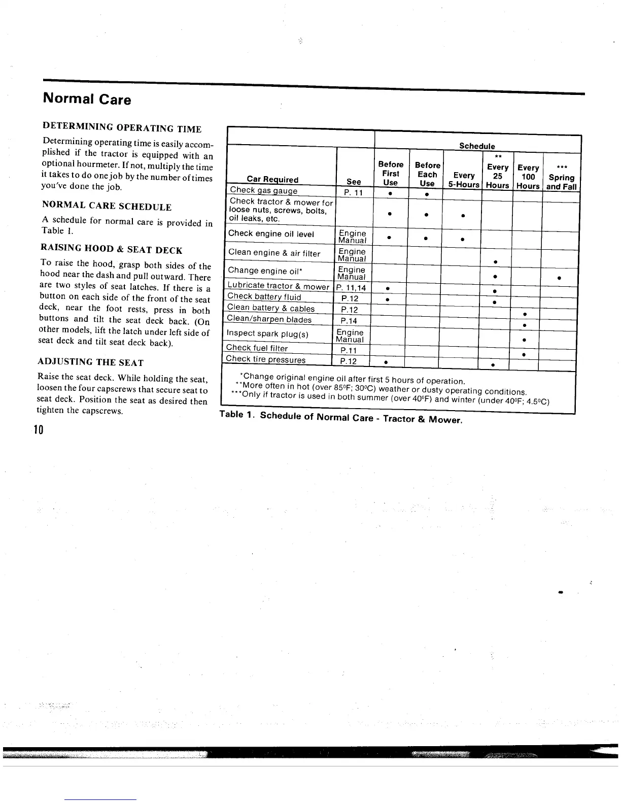 Simplicity Series 4200 - Normal Care; Determining Operating Time; Normal Care Schedule; Raising Hood & Seat Deck